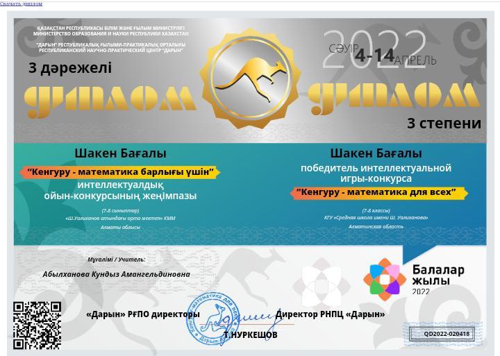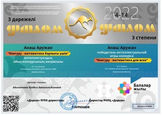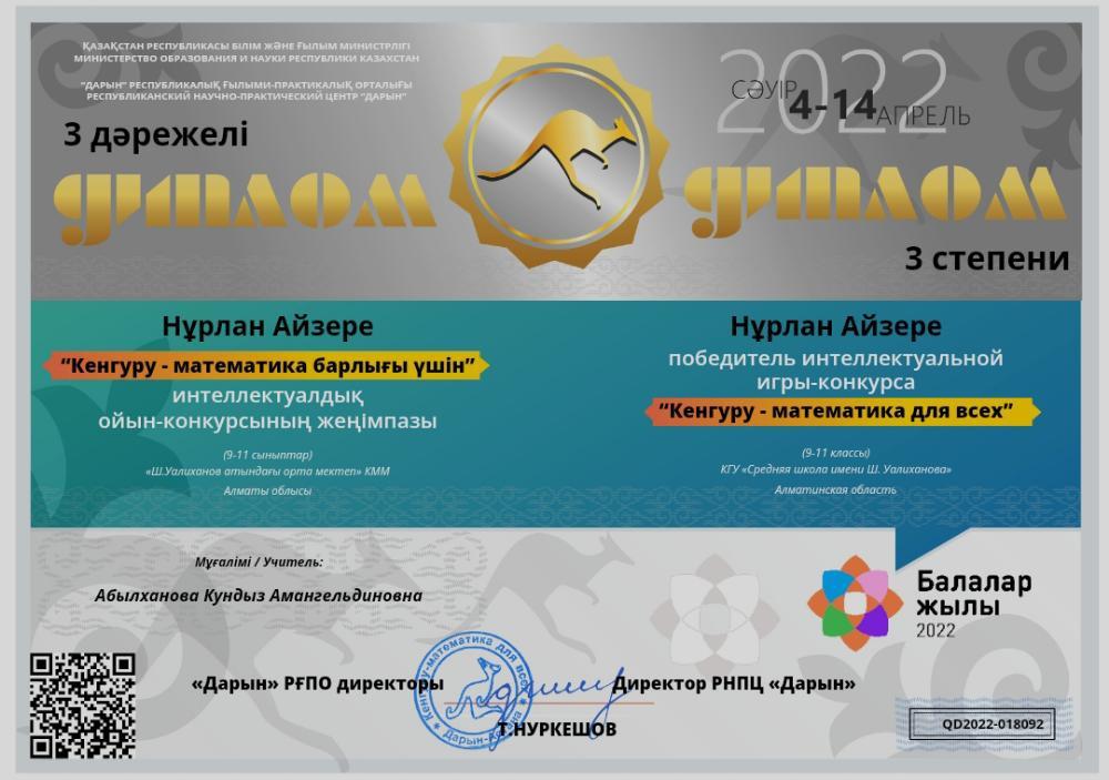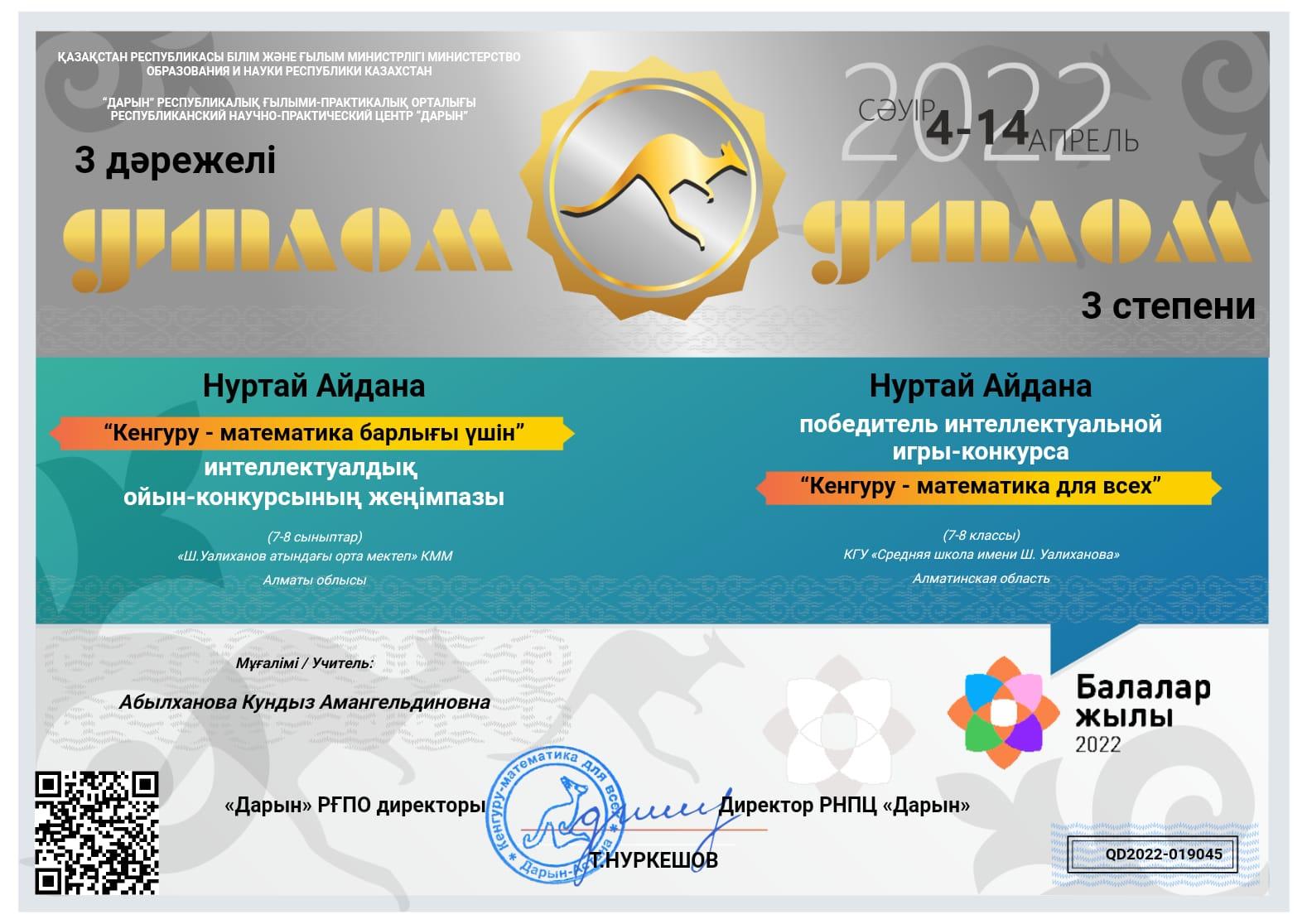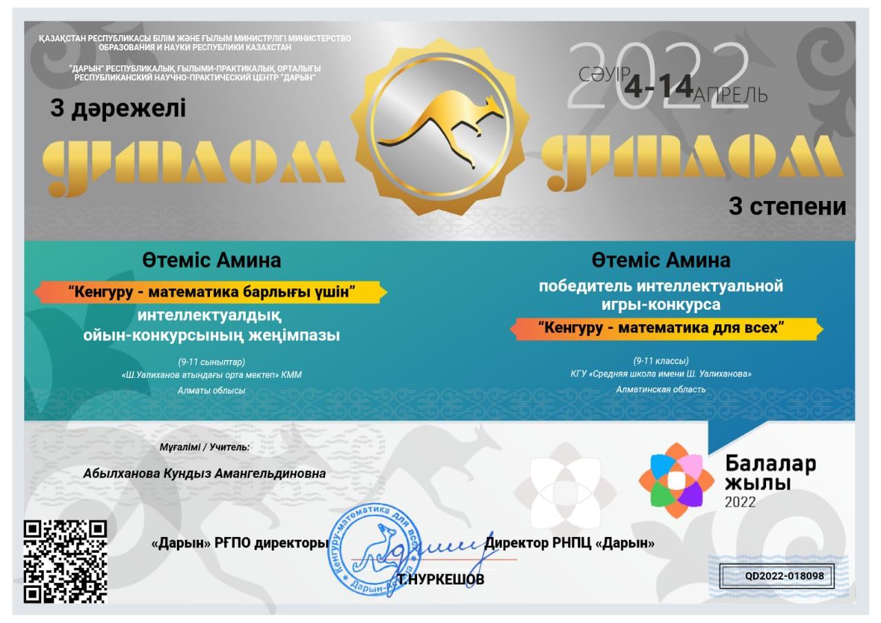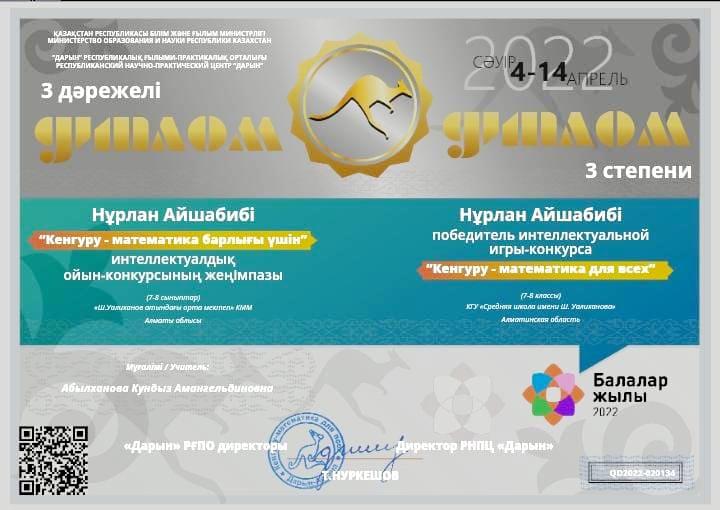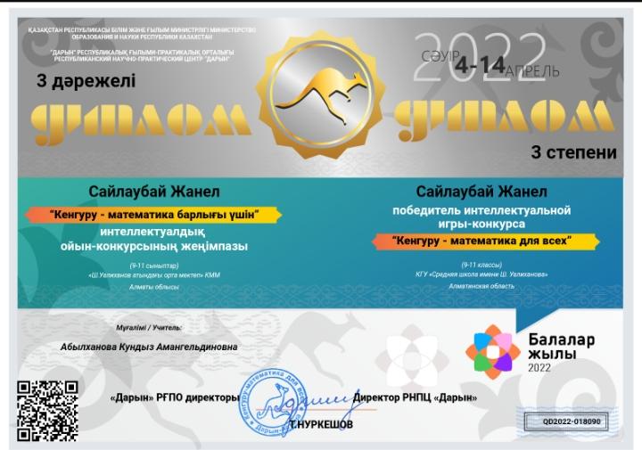 Абылханова Кундыз Амангельдиновна / Кенгуру-2022/ » Ш.Уәлиханов атындағы орта мектебі